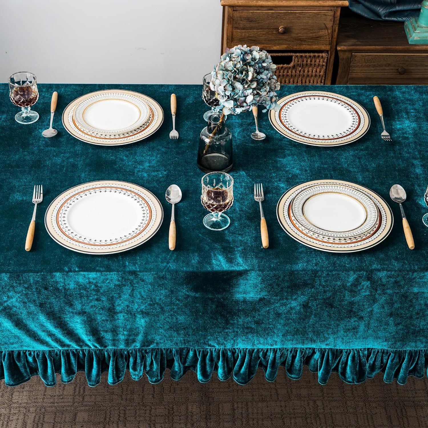 - INGENIOUS DESIGN: Velvet fabric release unique elegance and luxury style, vibrant colors with beautiful Flounces Trim which make this table cloth vintage and elegant.Soothing and serene comfort offer an fashionable way to update your home.This tablecloth will make your meal time more pleasent and luxurious. Suitable for dining room, kitchen room,wedding,party,banquet,baby shower,patio,gardens,outdoor decoration.
