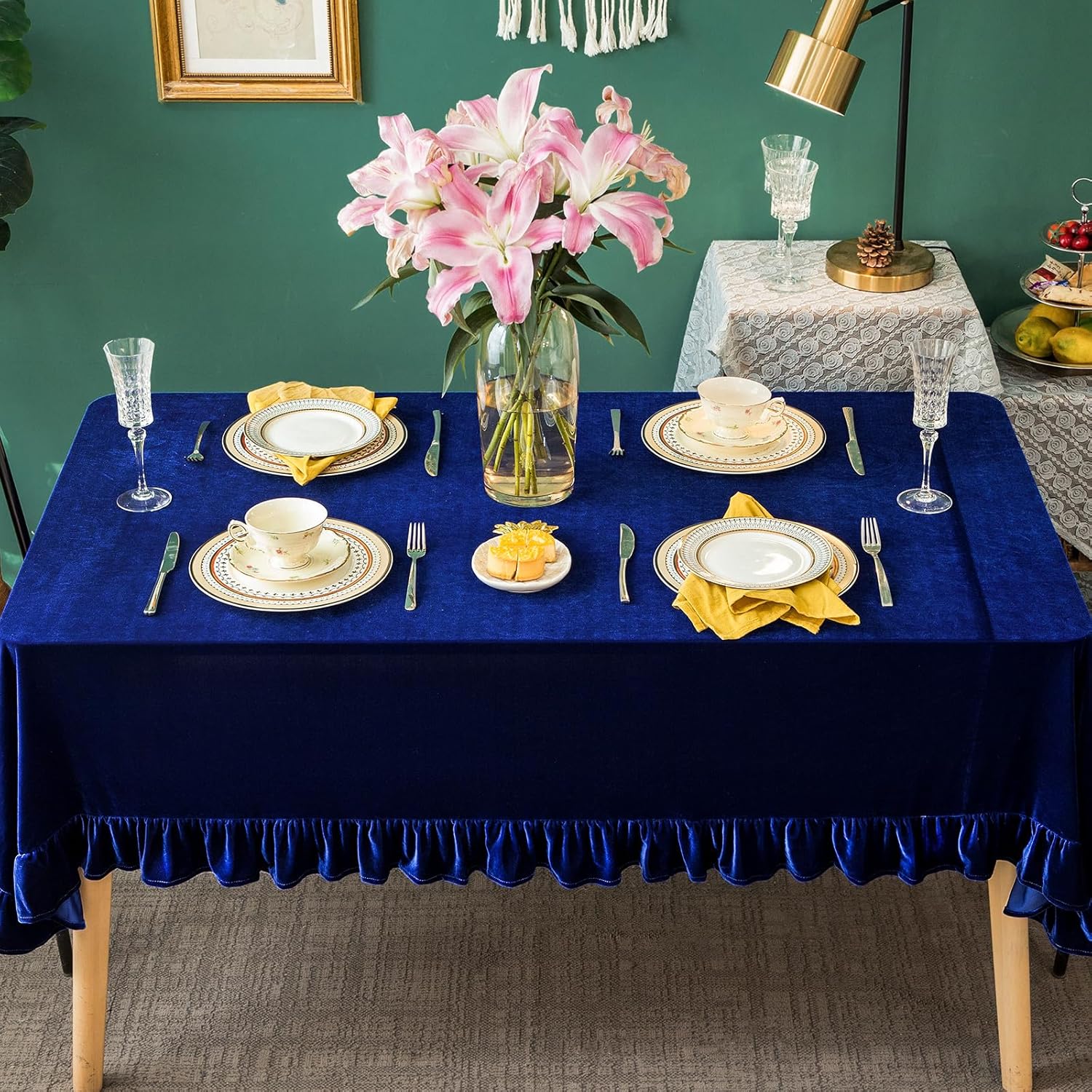 - INGENIOUS DESIGN: Velvet fabric release unique elegance and luxury style, vibrant colors with beautiful Flounces Trim which make this table cloth vintage and elegant.Soothing and serene comfort offer an fashionable way to update your home.This tablecloth will make your meal time more pleasent and luxurious. Suitable for dining room, kitchen room,wedding,party,banquet,baby shower,patio,gardens,outdoor decoration.