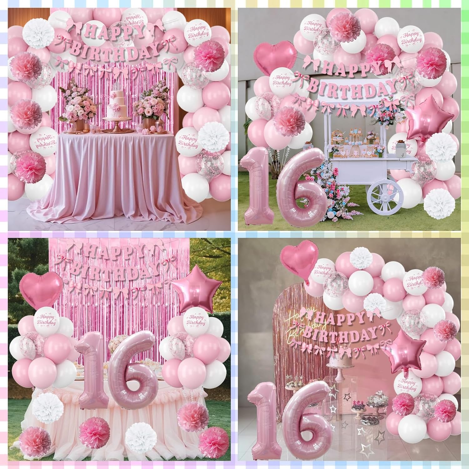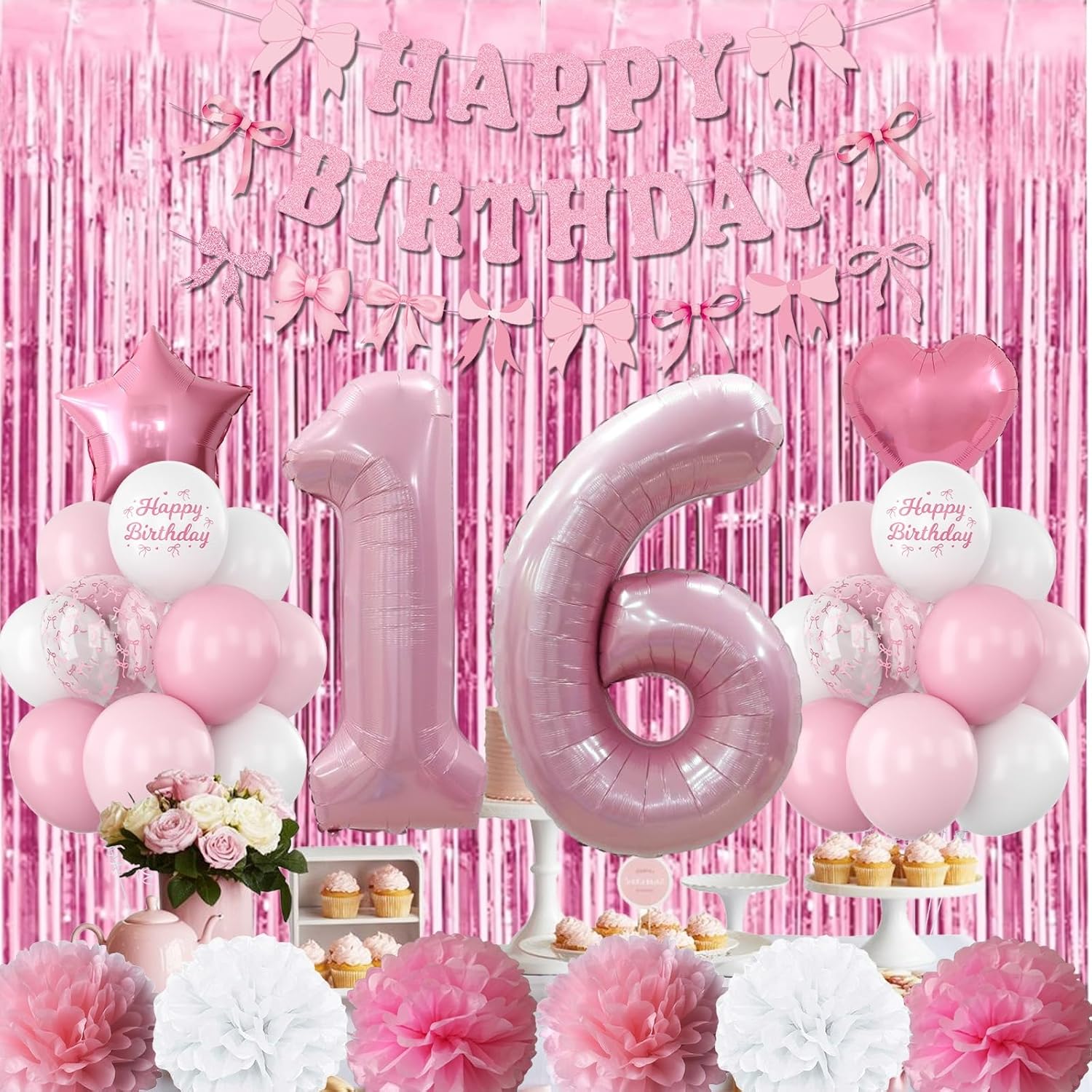 - PACKAGE INCLUDES: 1pc pearl pink number 16 balloon, 1pc bow happy birthday banner, 2pcs pink paper pom poms, 2pcs light pink paper pom poms, 2pcs white paper pom poms, 1pc pink curtain, 1pc light pink star foil balloons, 1pc light pink heart foil balloons,6pcs light pink balloons, 6pcs pastel pink balloons, 4pcs white balloons, 2pcs birthday printed balloons, 2pcs bow clear balloons, 1pc ribbon