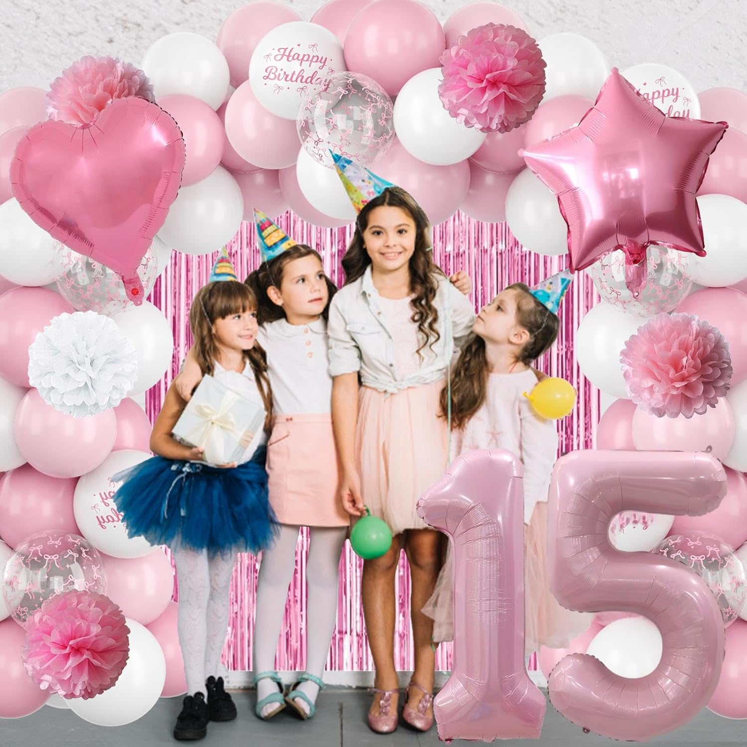 - Included Components : Pearl Pink Number 15 Balloon, Bow Happy Birthday Banner, 2pcs Pink Paper Pom Poms, 2pcs Light Pink Paper Pom Poms, 2pcs White Paper Pom Poms, Pink Curtain, Light Pink Star Foil Balloons, Light Pink Heart Foil Balloons, 6pcs Light Pink Balloons, 6pcs Pastel Pink Balloons, 4pcs White Balloons, 2pcs Birthday Printed Balloons, 2pcs Bow Clear Balloons, Ribbon Pearl Pink Number 15 Balloon, Bow Happy Birthday Banner, 2pcs Pink Paper Pom Poms, 2pcs Light Pink Paper Pom Poms, 2pcs White Paper Pom Poms, Pi… See more