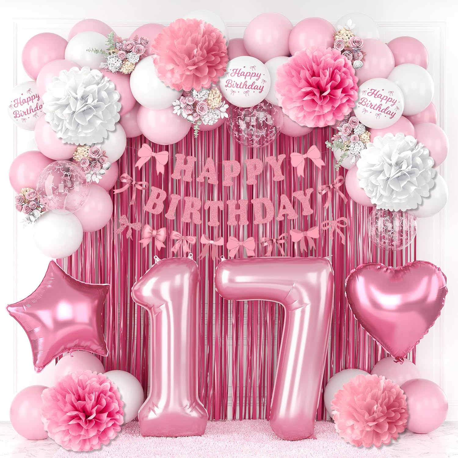 - ALL-IN-ONE DECORATION: Includes pearl pink number 17 balloon, bow “Happy Birthday” banner, pom poms, fringe curtain, foil balloons, latex balloons, special printed balloons, and ribbon – a complete set to decorate your party easily; designed especially for girls turning seventeen, this decoration set is ideal for birthday parties, home celebrations, and photography scenes, making the day extra memorable