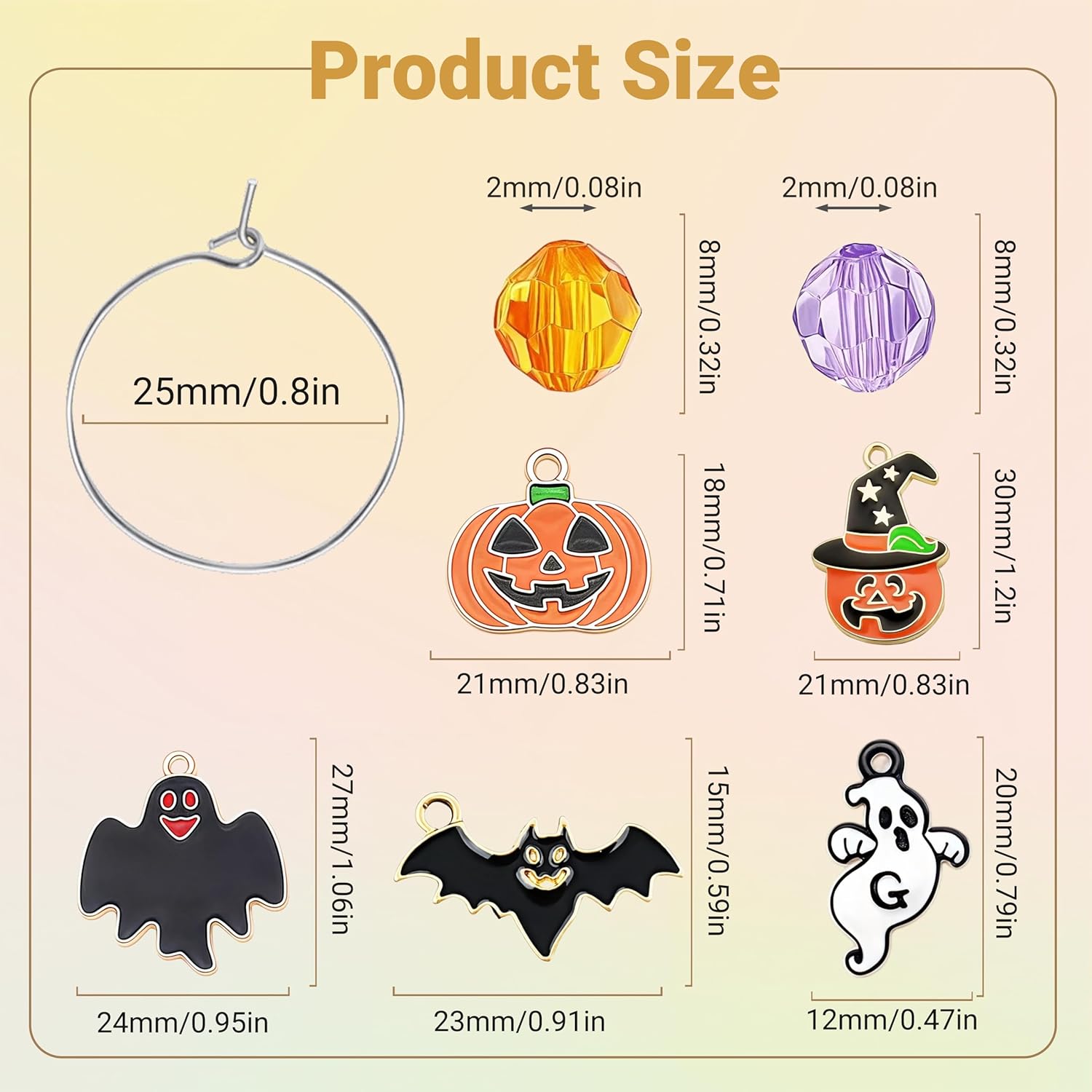- HALLOWEEN WINE GLASS CHARMS KIT: Host the ultimate haunted party with this all-in-one DIY set! You'll receive 50 silver-toned wine charm rings, 50 unique Halloween alloy charms, 100 pumpkin-orange faceted beads, and 100 mystical-purple faceted beads. This massive kit ensures every guest can easily identify their glass, adding a fun, interactive element to your spooky celebration.