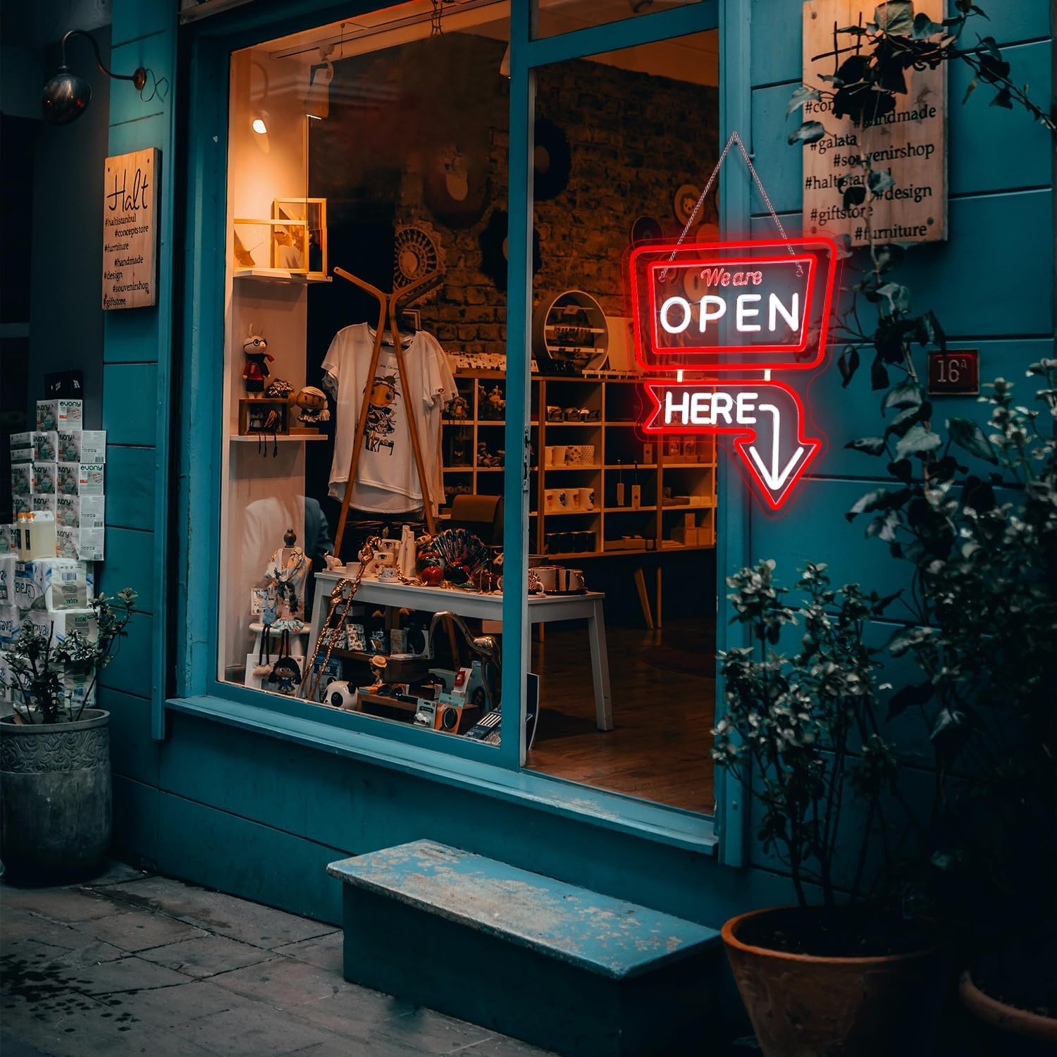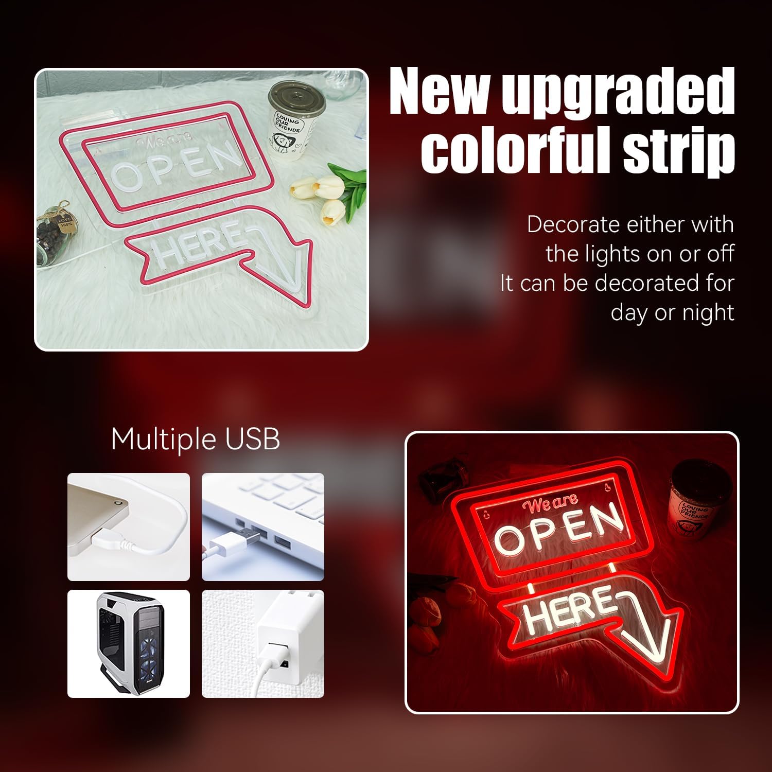 - UNIQUE DESIGN:The Neon lights are designed with the perfect combination of arrow and text "we are open here",bold and charming, easily becoming the visual focus in the space.Whether placed on a desktop, bookshelf, or hung on a wall or window, it can instantly light up the space without being bulky