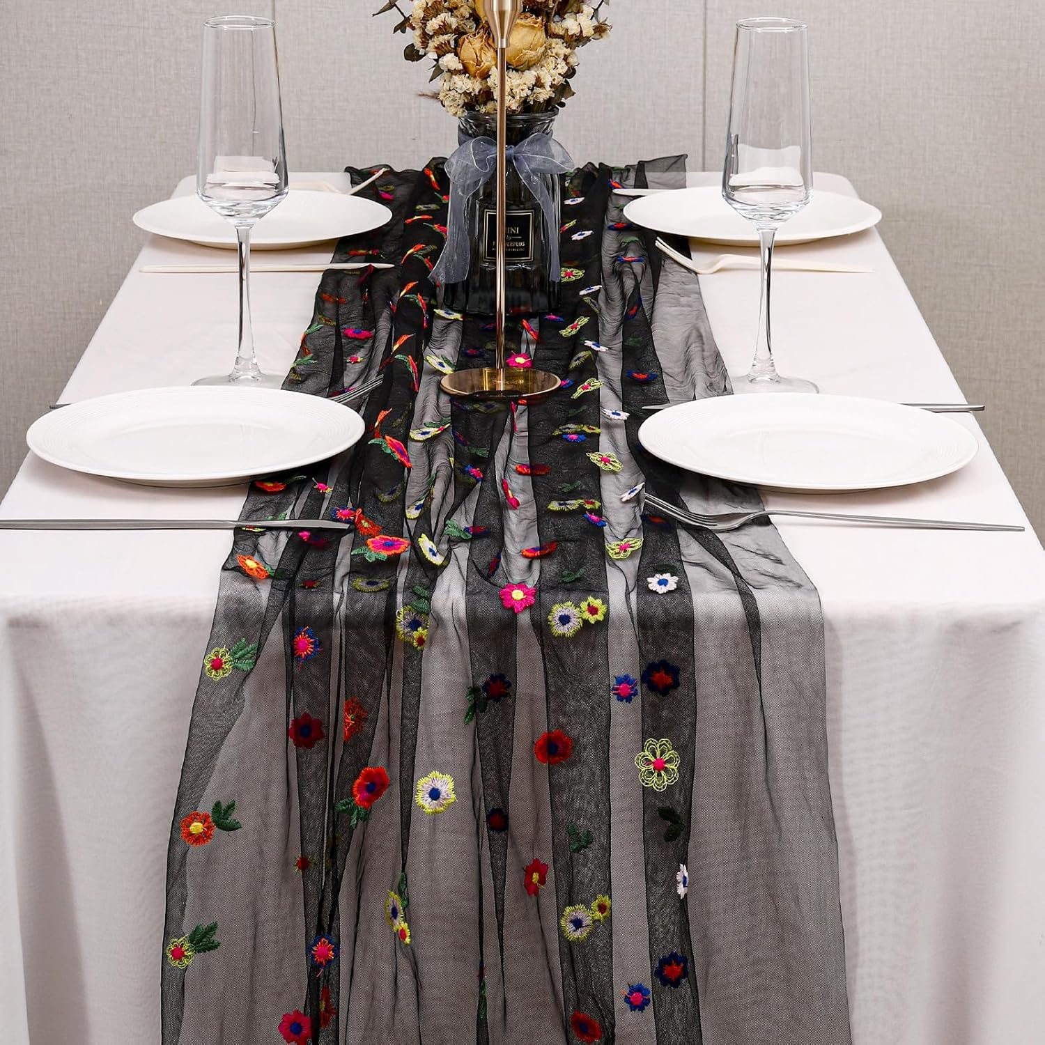 BINBE 12pcs Daisy Fall Table Runner Embroidery Gauze 10FT Florals Seasonal Tulle Holiday Birthday Kitchen Dining Table Decor for Home Party Black