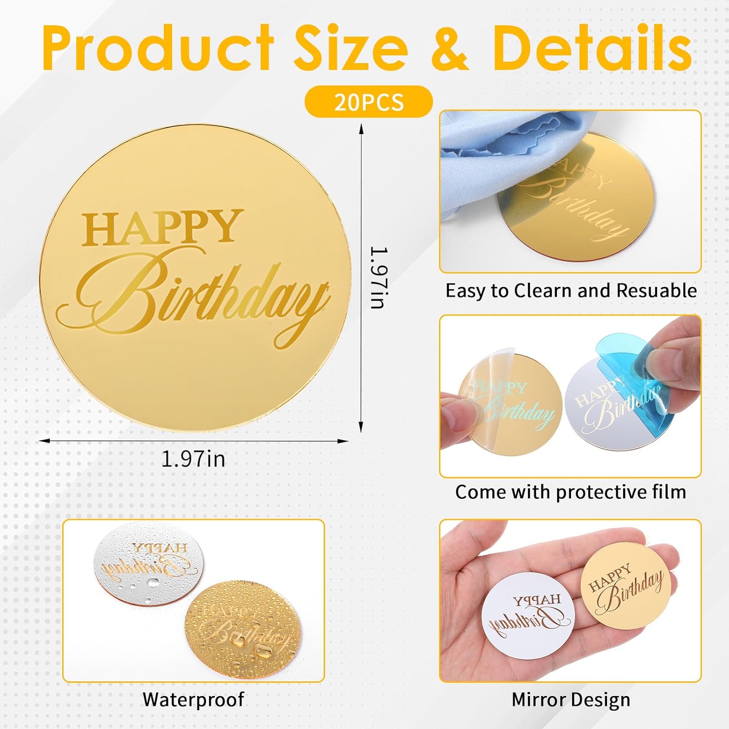 20 Pcs Acrylic Cupcake Toppers Circle Mirror Cake Toppers Disc Happy Birthday Cake Decoration Acrylic Engraved Cakes Picks Personalized Mirror Decoration for Birthday Party DIY Supplies