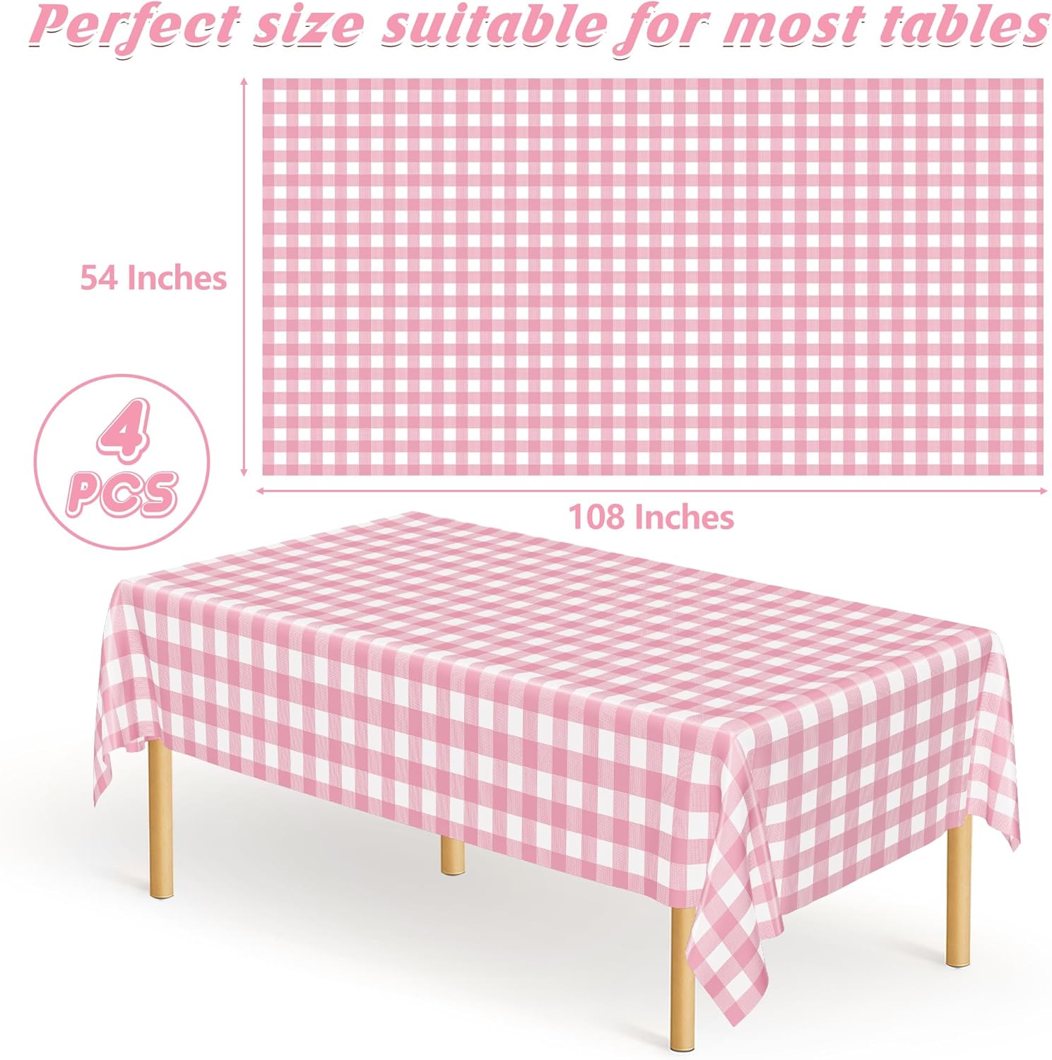 4Pack Pink Table Cloth, 54" x 108" Plastic Table Cloth Disposable, Waterproof Picnic Table Cover Checkered Rectangle Tablecloths for Indoor Outdoor Picnic Birthday Party Supplies Gathering BBQ Holiday