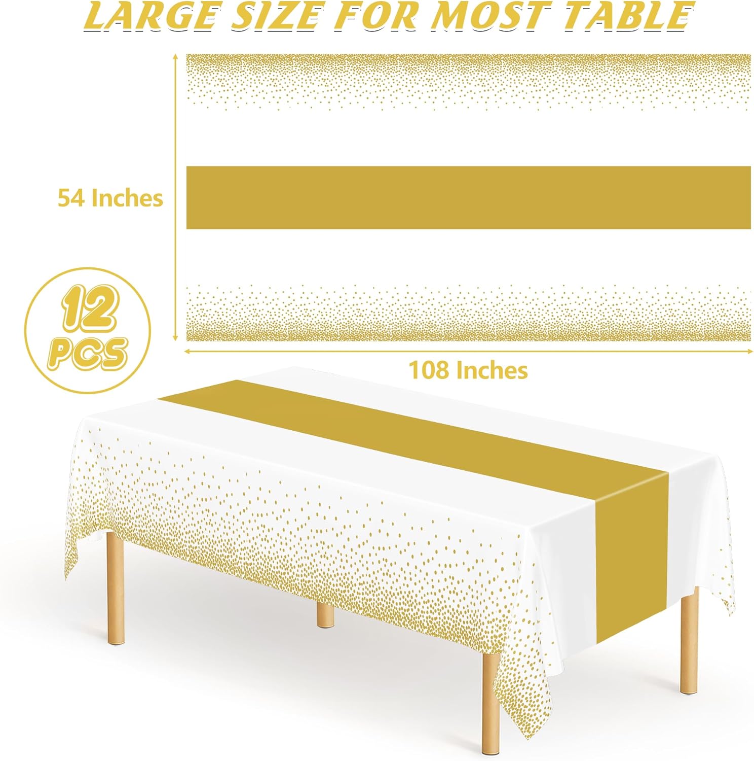 QZYL 12Pack Table Cloth Rectangle Tables, 54" x 108" Disposable Party White Table Cloths with Gold Dot, Waterproof Table Covers for Birthday Outdoor Wedding New Year Eve Birthday Decorations Supplies