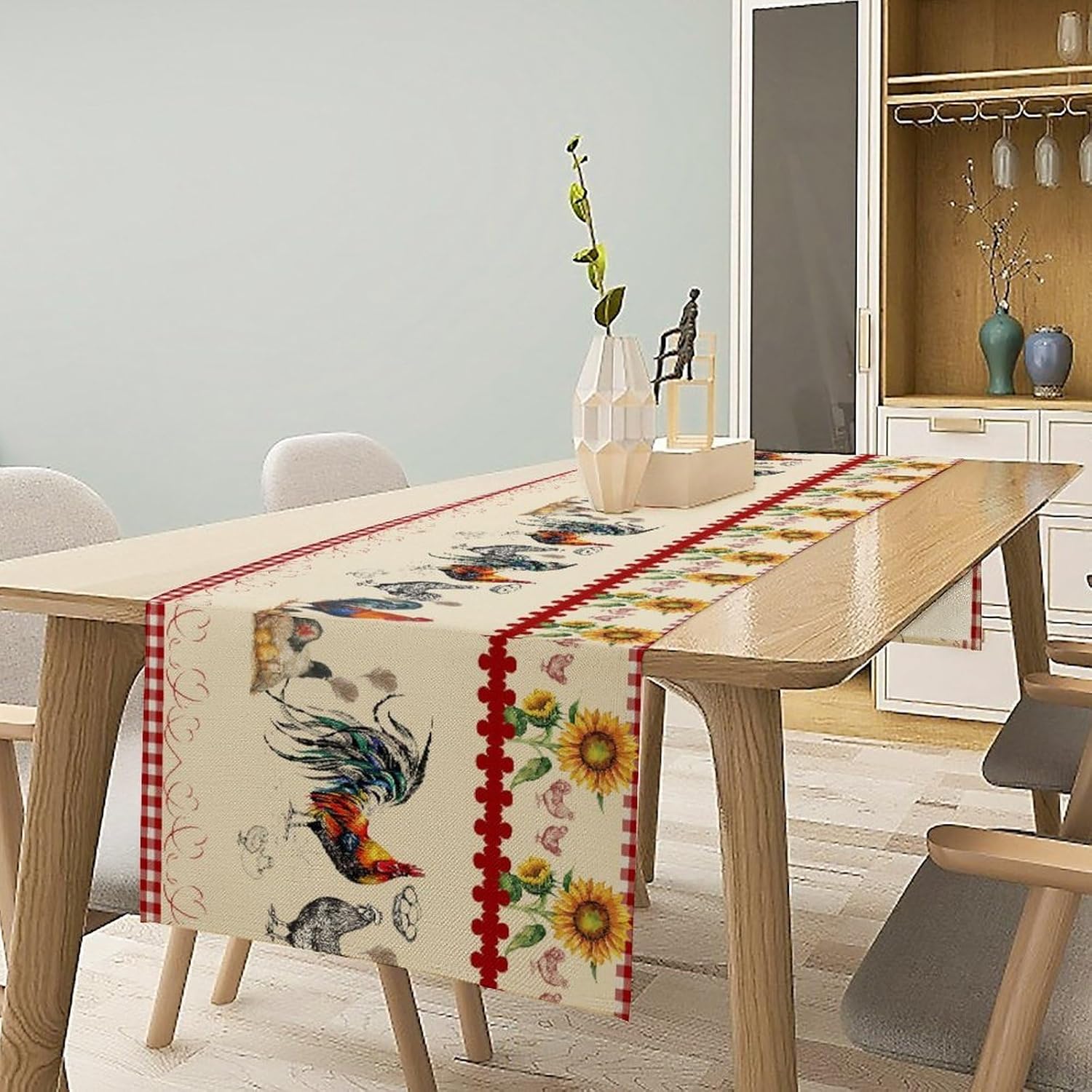 Rustic Rooster Table Runner,Vintage Country Farm Sunflower Chicken Red Plaid Print Tablecloth Burlap for Hotel Indoors Outdoor Dining Room Kitchen Home Decor,W13X L90 in