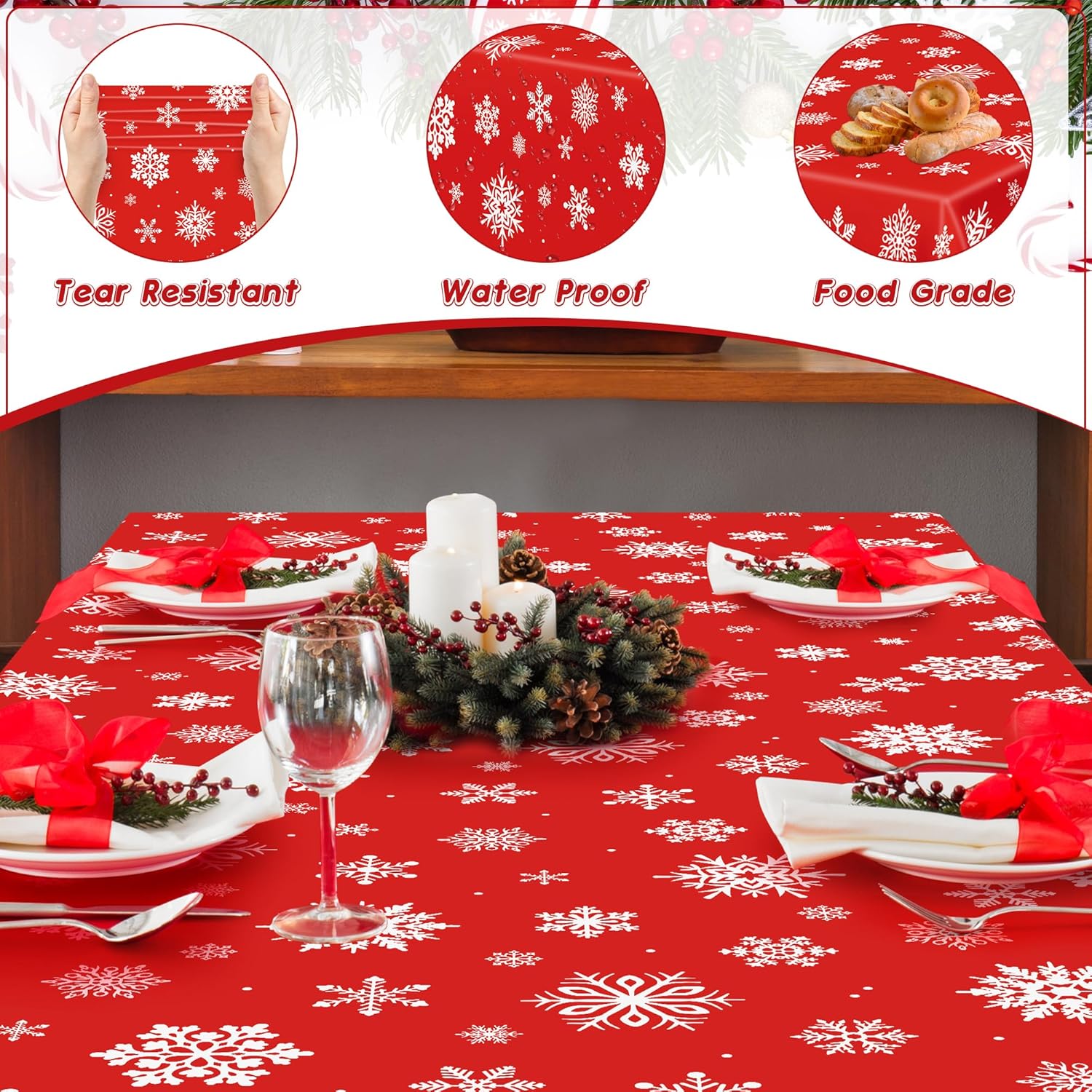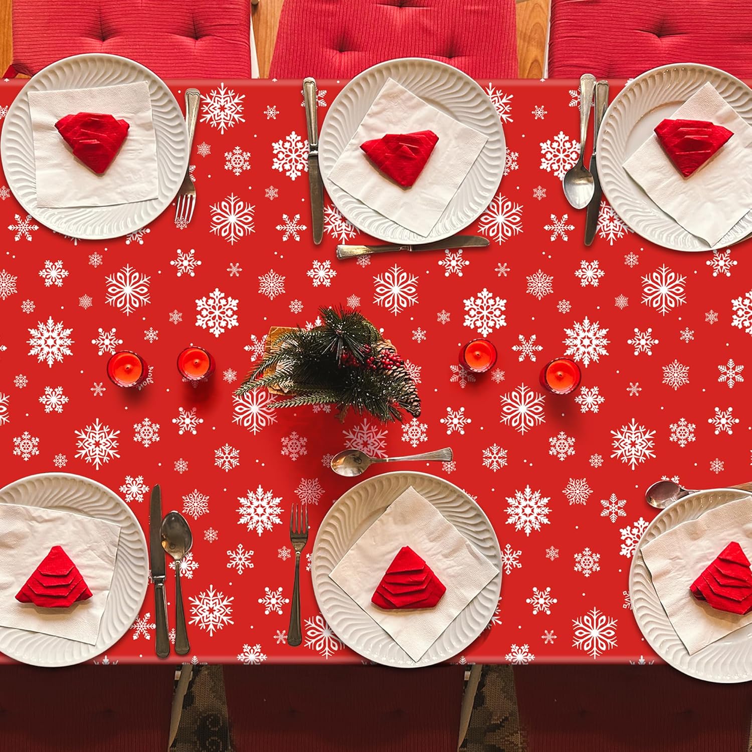 - Snowflakes Design: This plastic Christmas tablecloth features a red background adorned with countless white snowflake patterns, making it suitable for your Christmas party.
