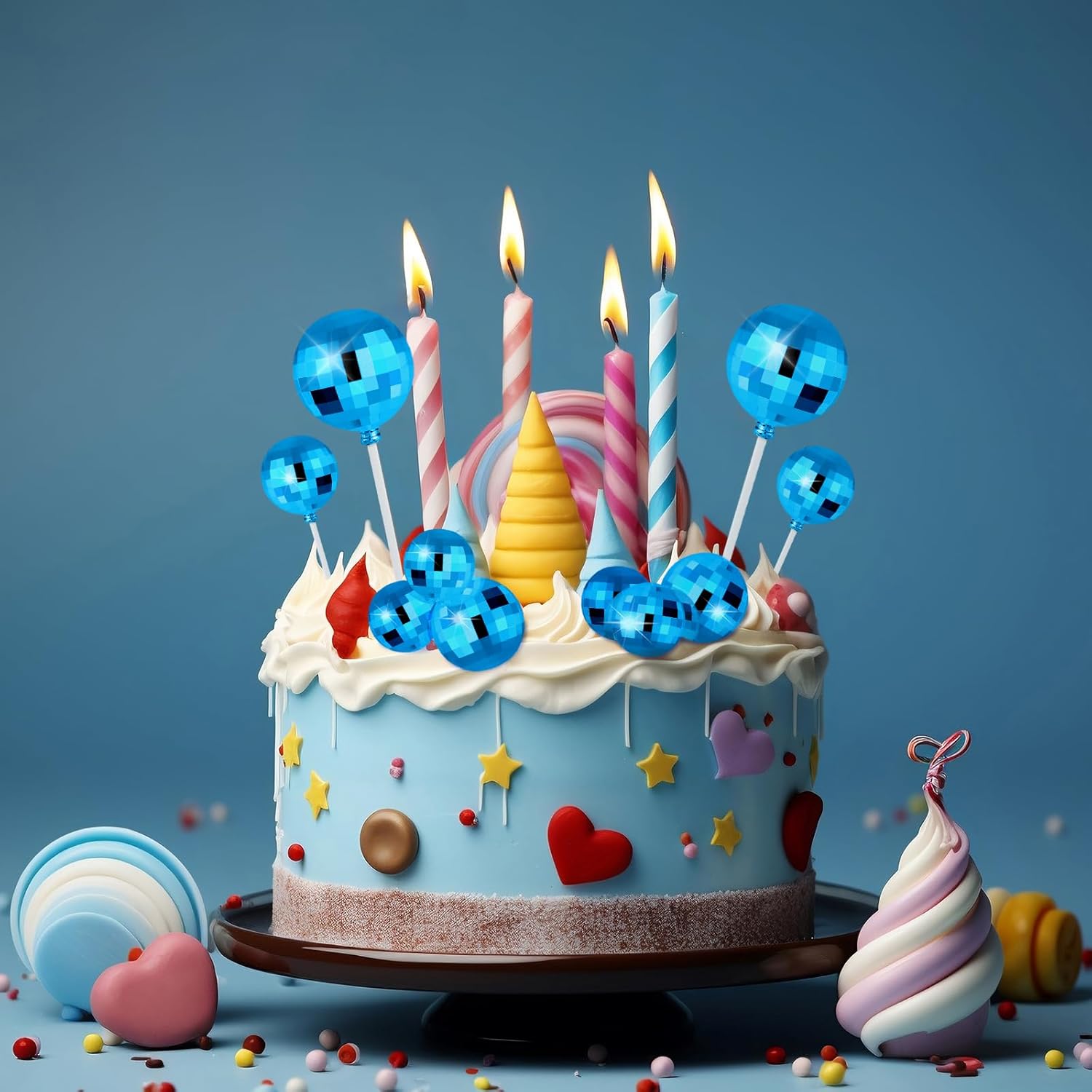 ASTARON 20 Pcs Disco Ball Cake Topper Decorations Sticks Blue Cake Balls Picks Toppers for Birthday Anniversary Disco Retired Theme Party Decorations