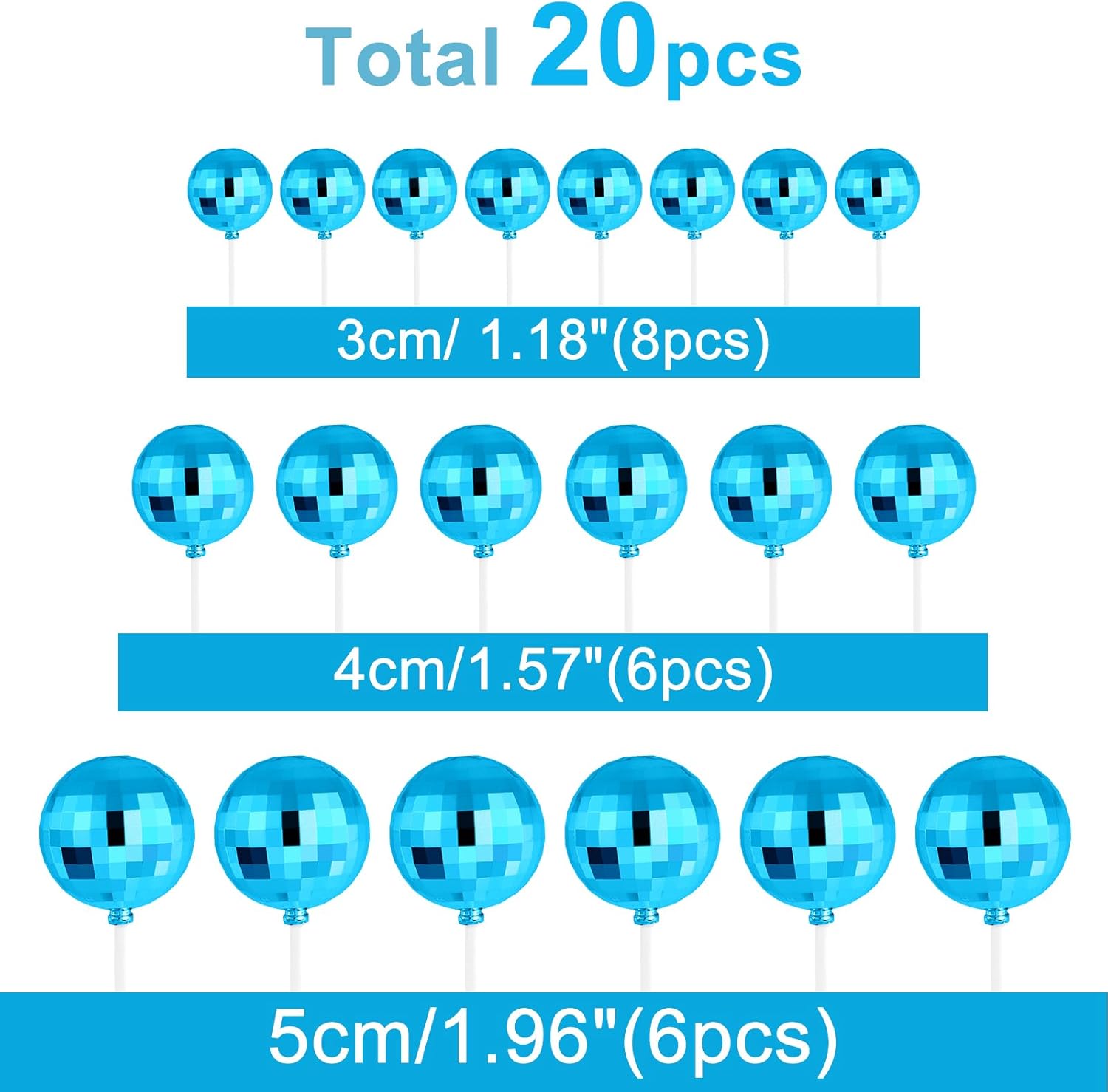 - Package includes: 20 pcs blue disco balls for cake decorations. there are 8 balls with a diameter of 1.18 inches/ 3 cm, 6 balls with a diameter of 1.57 inches/ 4 cmīŧ6 balls with a diameter of 1.96 inches/ 5 cm.