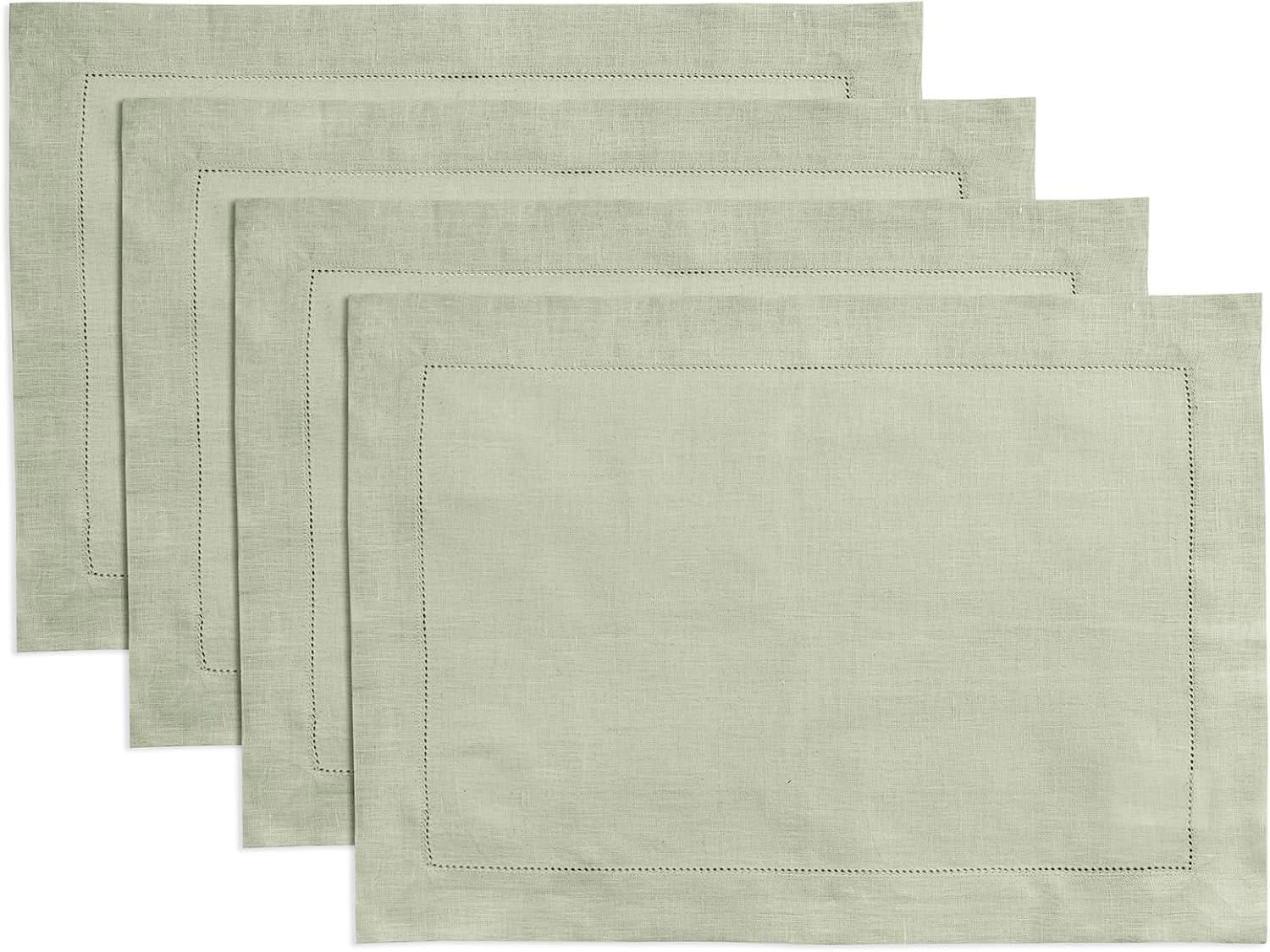 100% Pure Linen Sage Green Placemats 14 x 19 Inch - Hemstitch Christmas Dinner Placemat Set of 4 - Elegant Cloth Fabric Table Mats for Thanksgiving, Winter, New Year - Elara