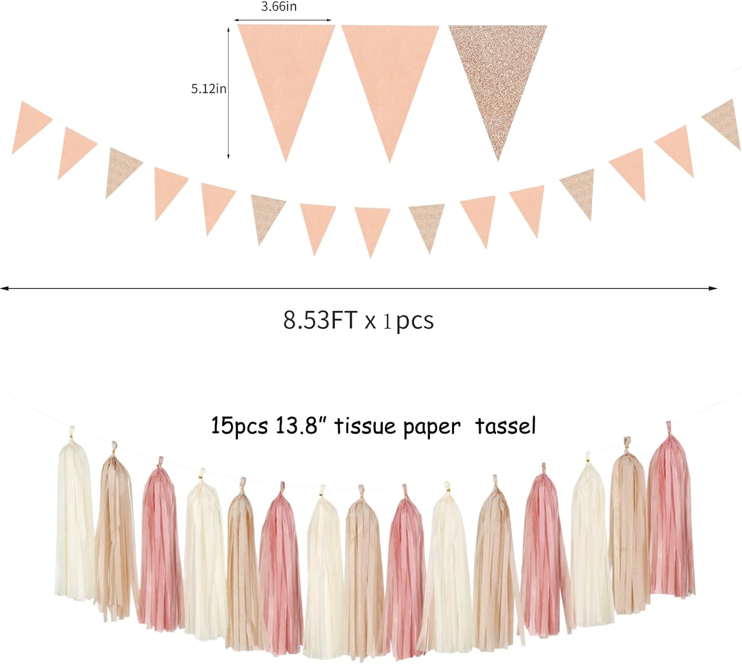 Pink Champagne-Peach Rose-Gold Boho Party Decorations - 23pcs Women Girls Birthday Tissue Pom Poms Streamers,Baby Bridal Shower Tassel Garland Banner,Rustic Wedding Graduation Decor Backdrop Ouruola