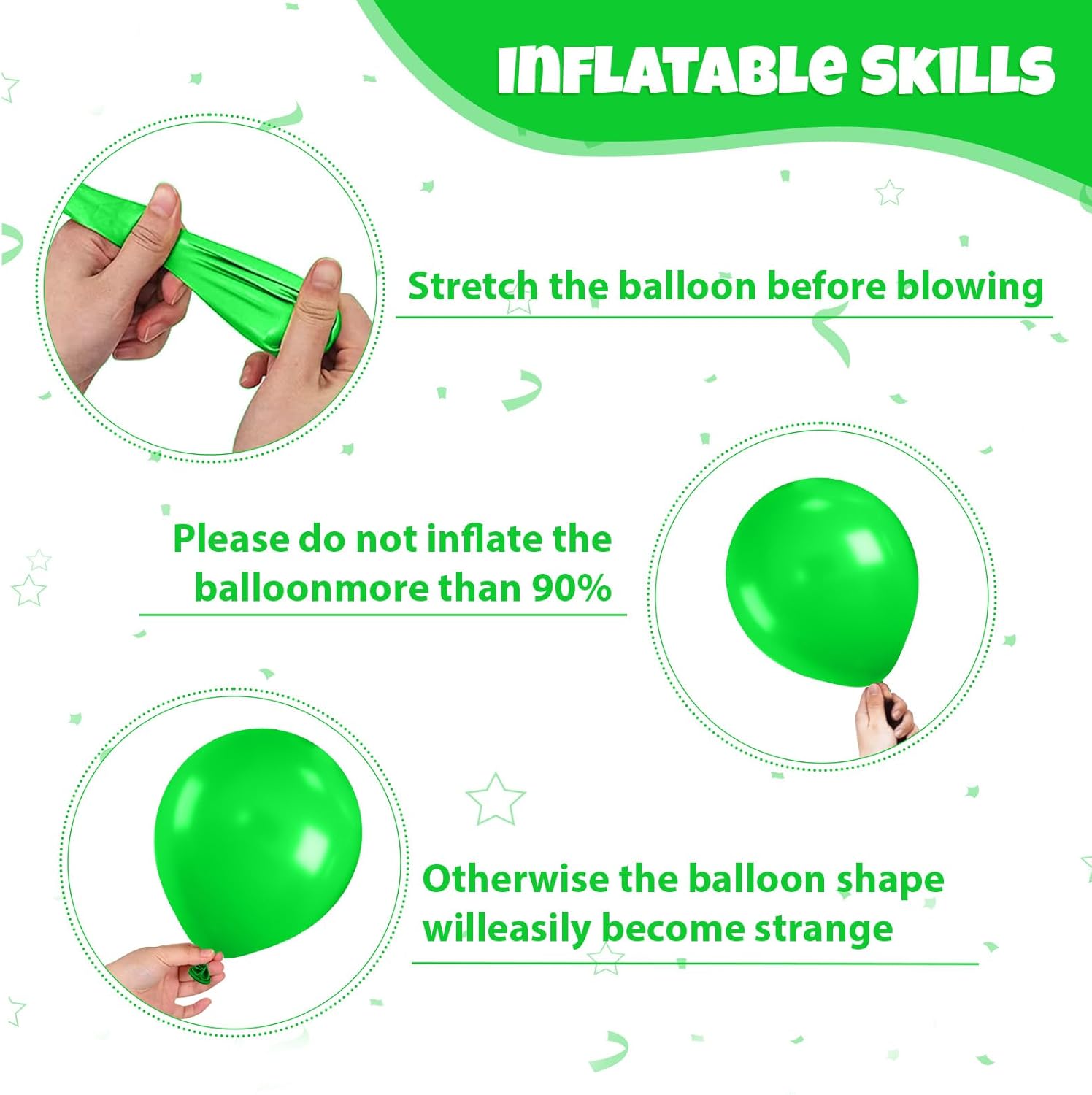 - Balloon material: All balloons are made of natural latex, and each balloon has been strictly hand-tested. The balloons are elastic, non-toxic, harmless and safe. They can be filled with air or helium, and it is recommended to use with a balloon pump