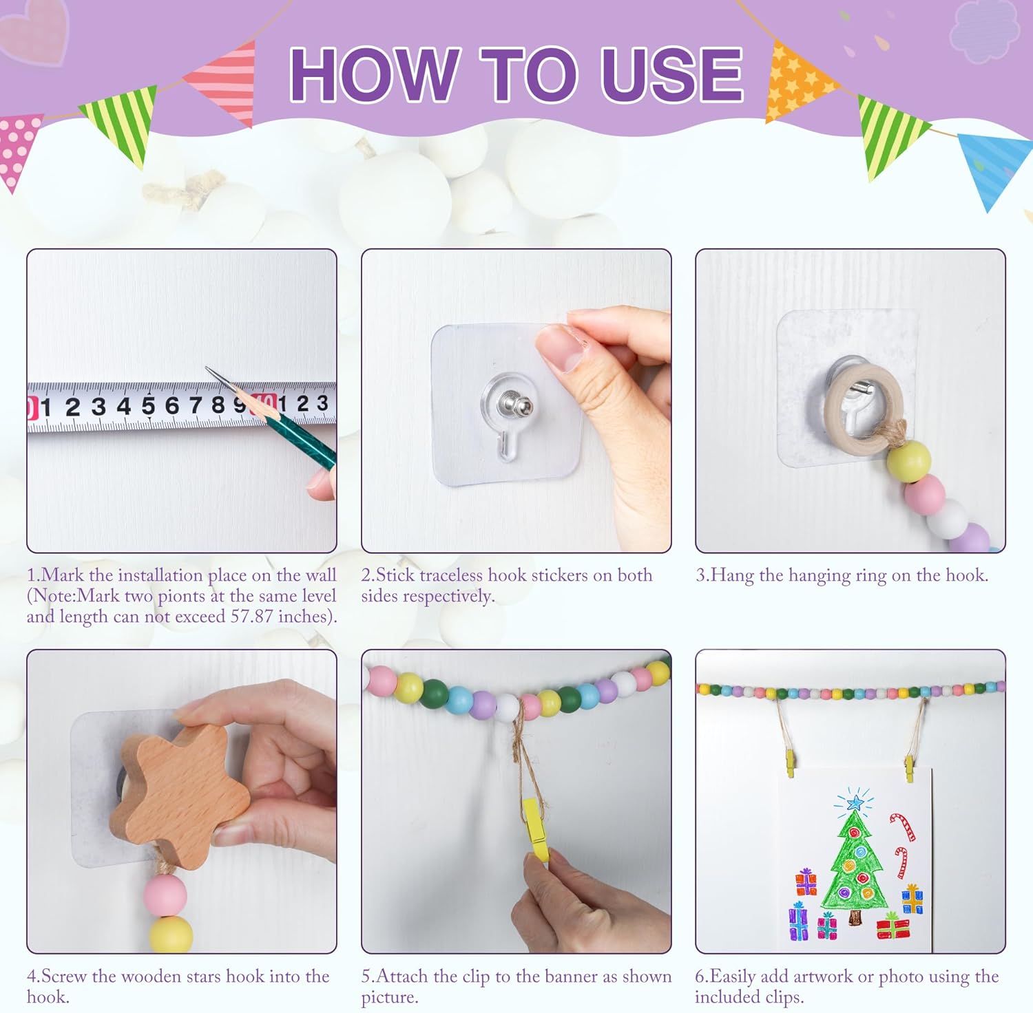 - Package: Total length of wooden bead garland: 59". It is equipped with 40 wooden clips(12 single clips with wooden beads+28 double head clips), 2pcs Wooden stars hook , 2pcs Traceless hook sticker, 2pcs Hardwall hanger garland which can show many children's artworks