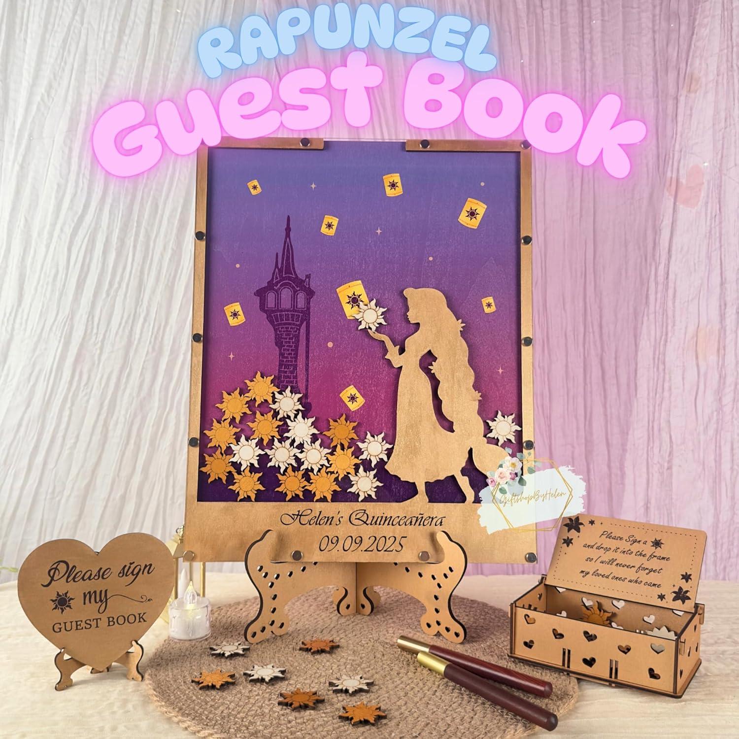 - 👑 Princess-Inspired Design – Featuring a princess silhouette, magical tower, and lanterns, this guest book alternative is perfect for a fairytale-themed Sweet XV celebration.