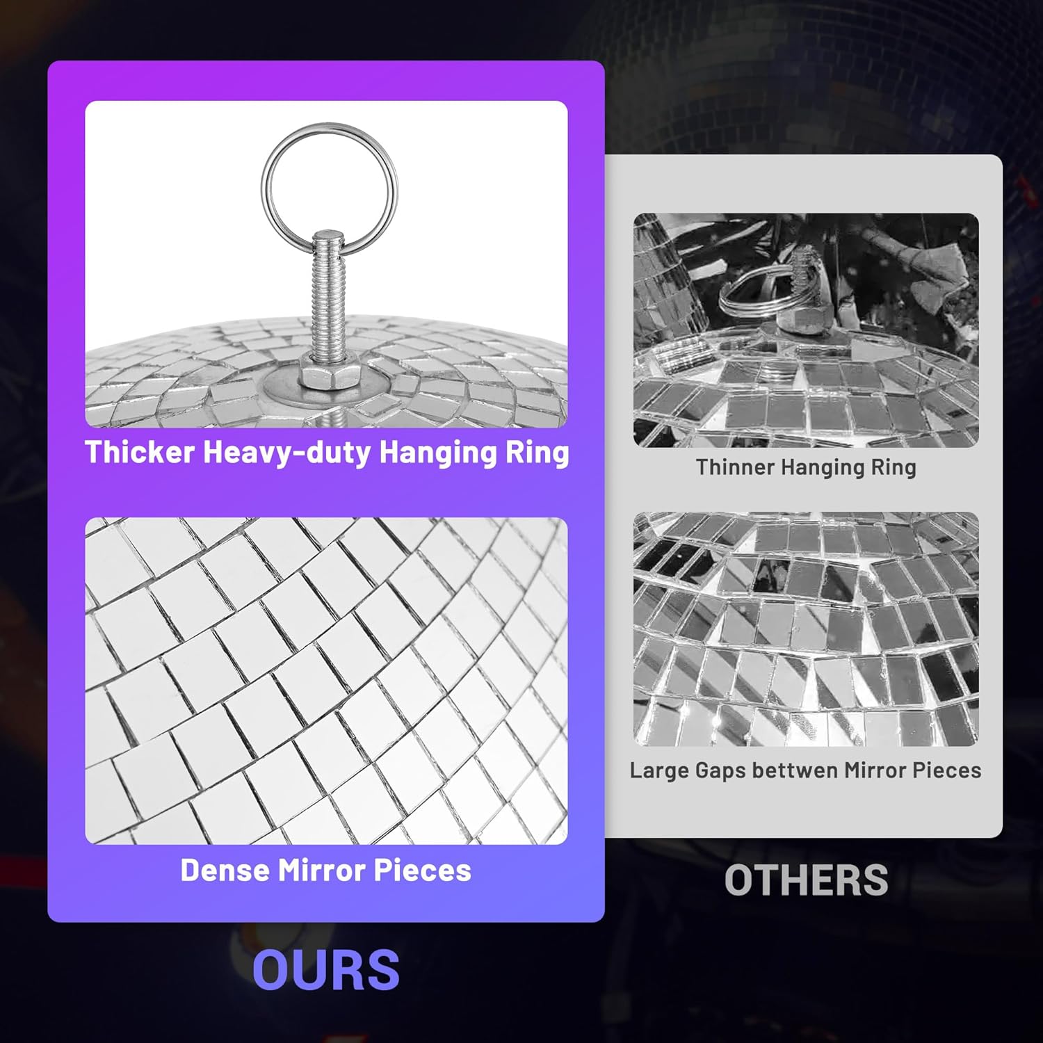 - Easy Installation - No assembly required, with a built-in hanging ring that easily attaches to a rotating motor, or place the mirror ball on the floor or anywhere you like for decoration