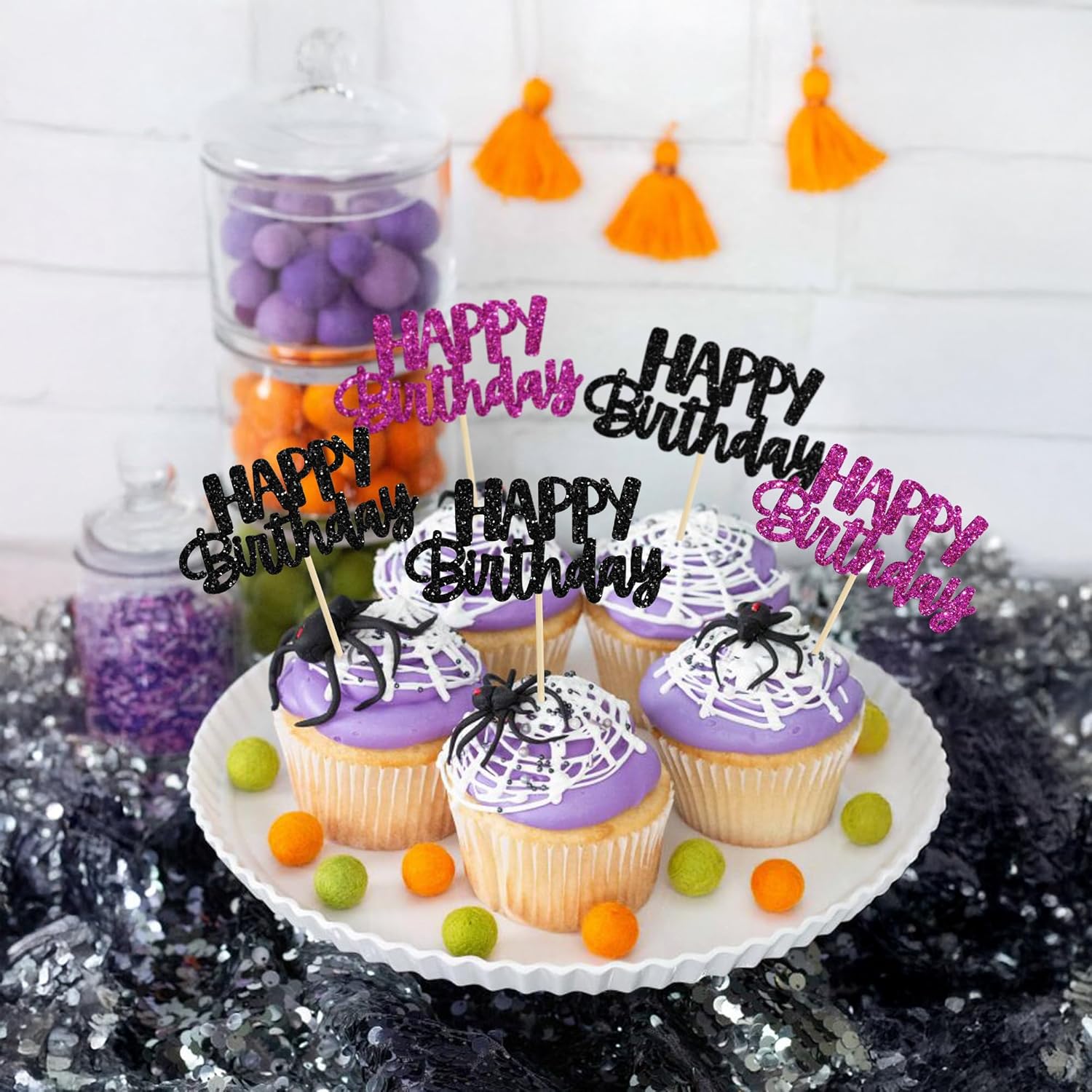 Gyufise 24Pcs Happy Birthday Cupcake Toppers Glitter Birthday Cake Topper Decorations for Celebrating Halloween Theme Party Decorations Supplies Black Purple