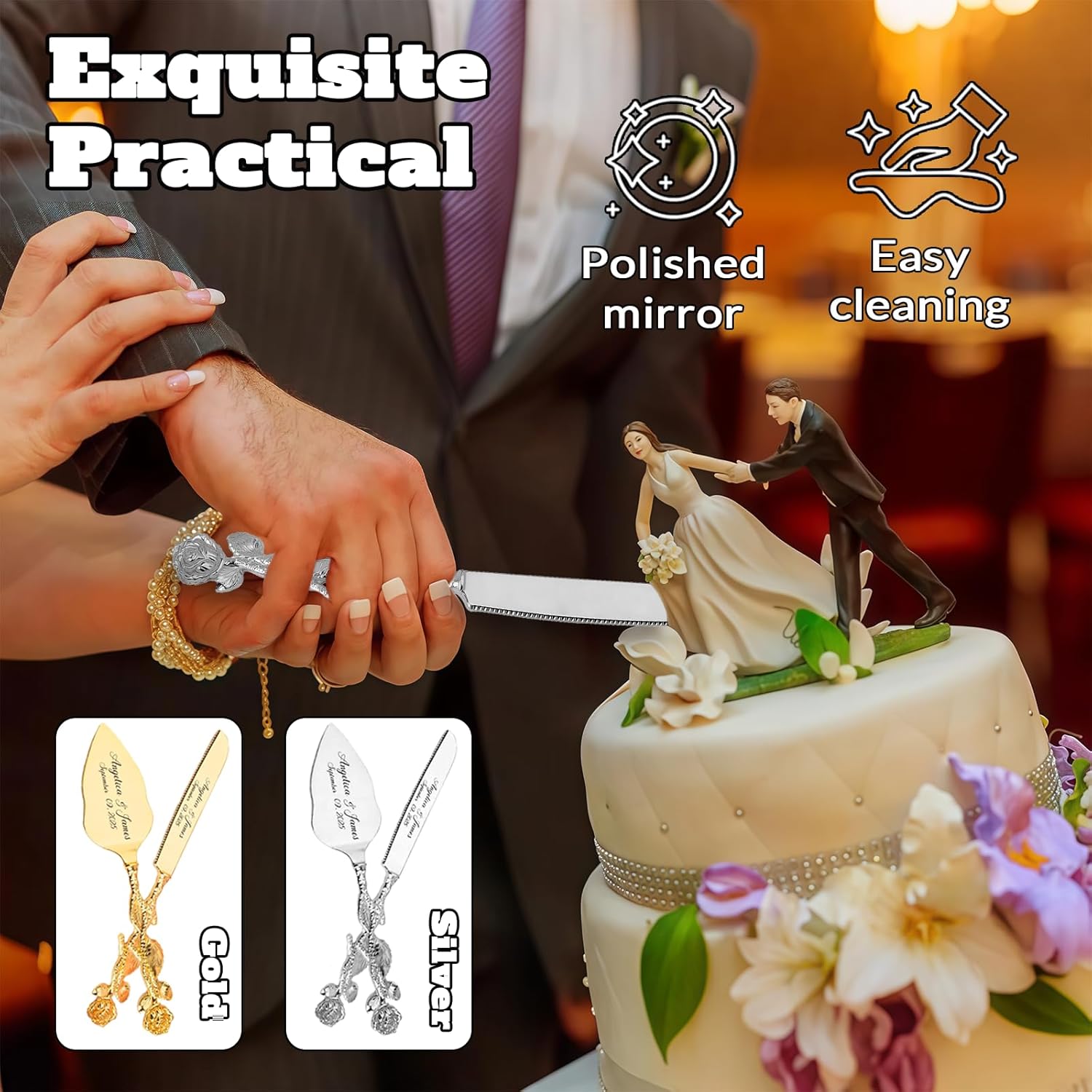 Personalized Wedding Cake Knife and Server Set, Custom Name/Date Cake Cutting Set for Wedding, Customized Cake Cutter for Bridal Anniversary Birthday Couple Gifts (Rose-Silver)