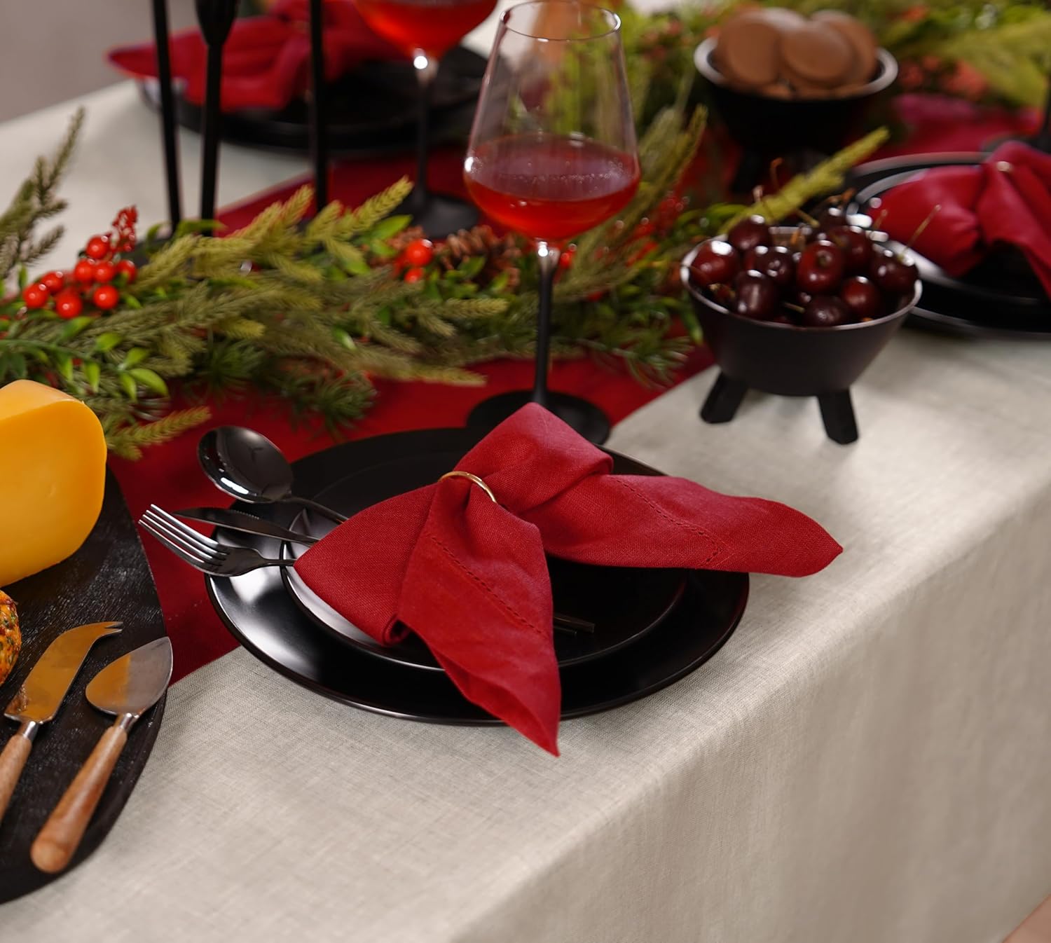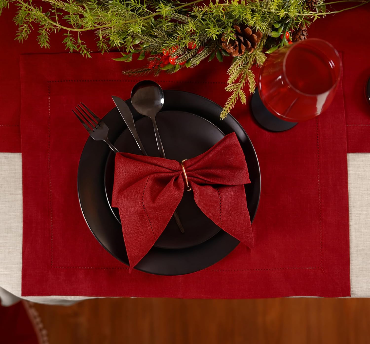 100% Pure Linen Red Napkins 20 x 20 Inch - Hemstitch Christmas Dinner Napkins Set of 4 - Cloth Fabric Napkins for Thanksgiving, Winter, New Year - Elara