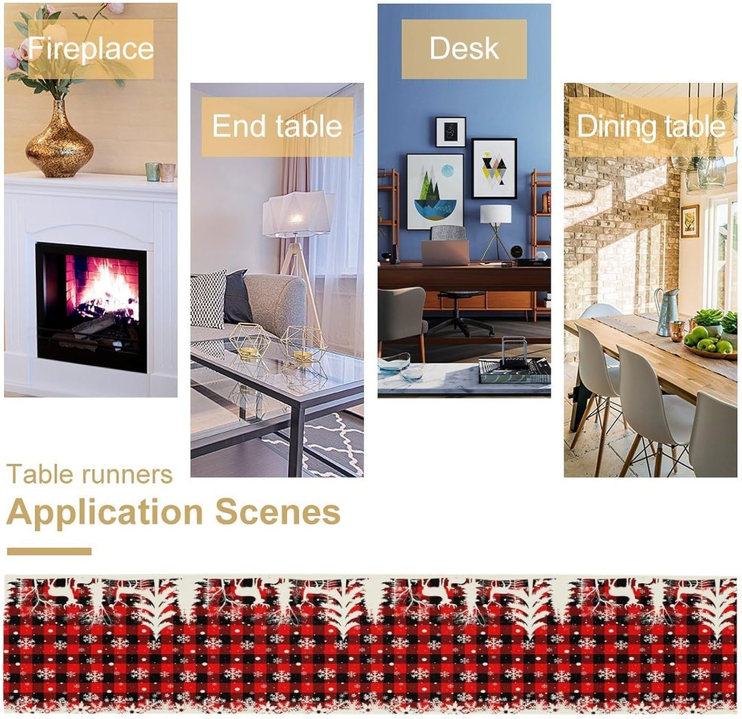 Christmas Table Runner,Red Black Plaid Xmas Snowflakes Deer Trees Print Tablecloth Burlap for Hotel Indoors Outdoor Dining Room Kitchen Home Decor,W13X L90 in