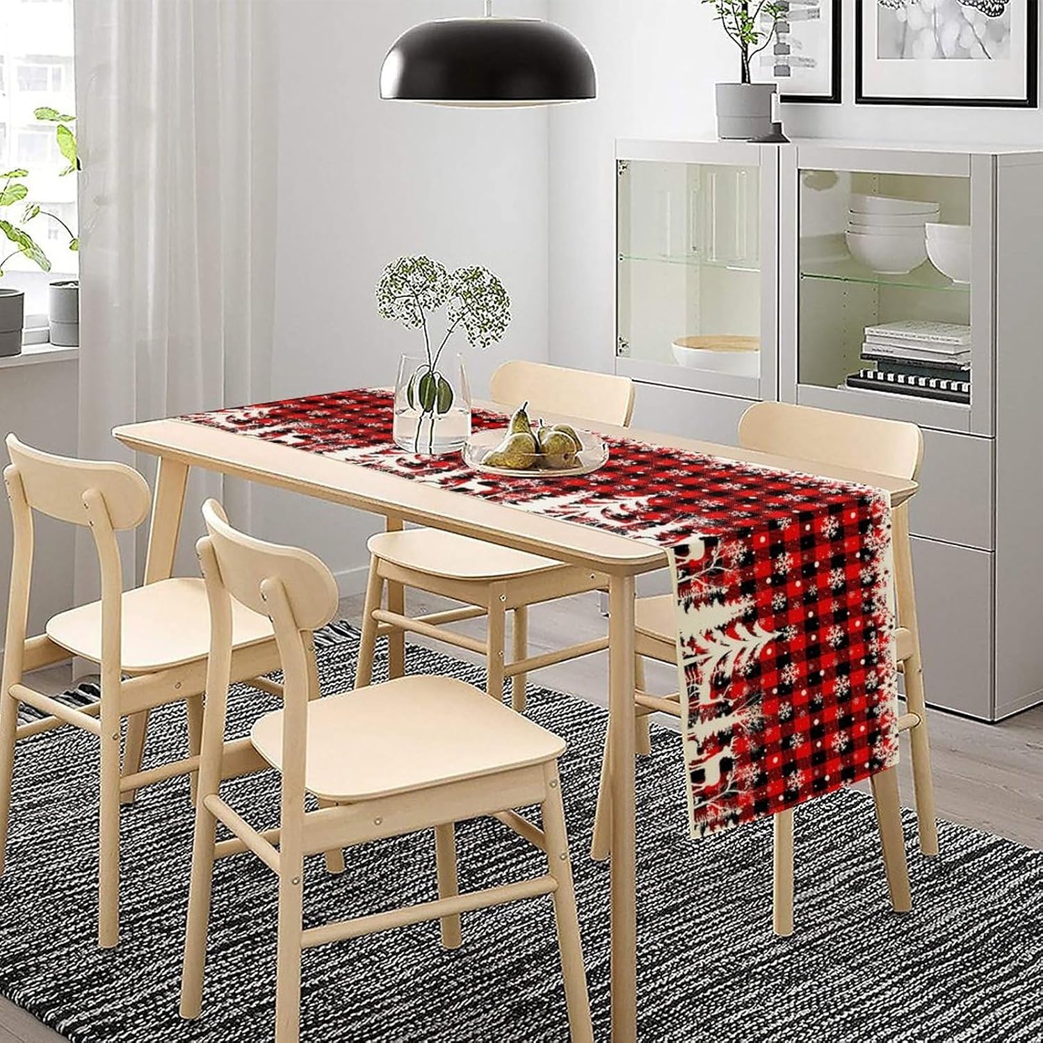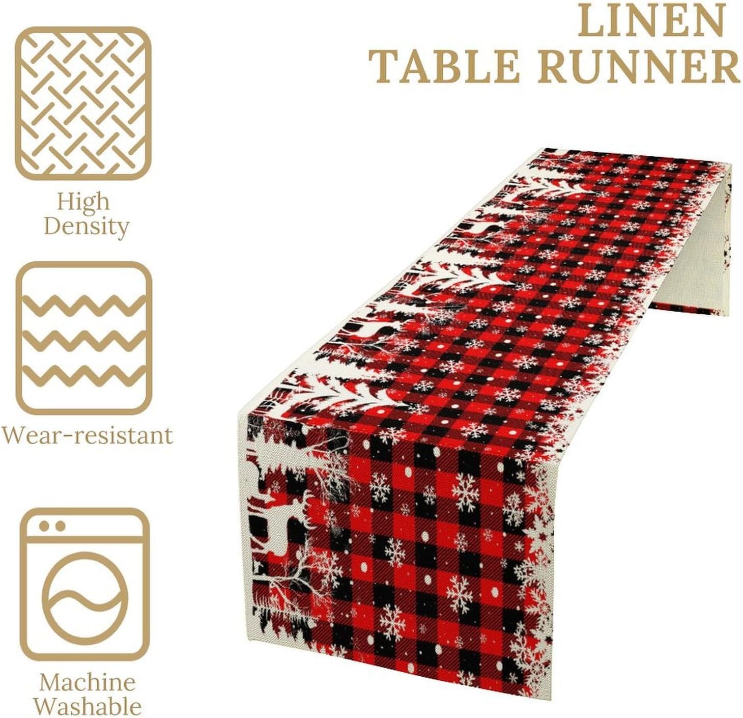 Christmas Table Runner,Red Black Plaid Xmas Snowflakes Deer Trees Print Tablecloth Burlap for Hotel Indoors Outdoor Dining Room Kitchen Home Decor,W13X L60 in