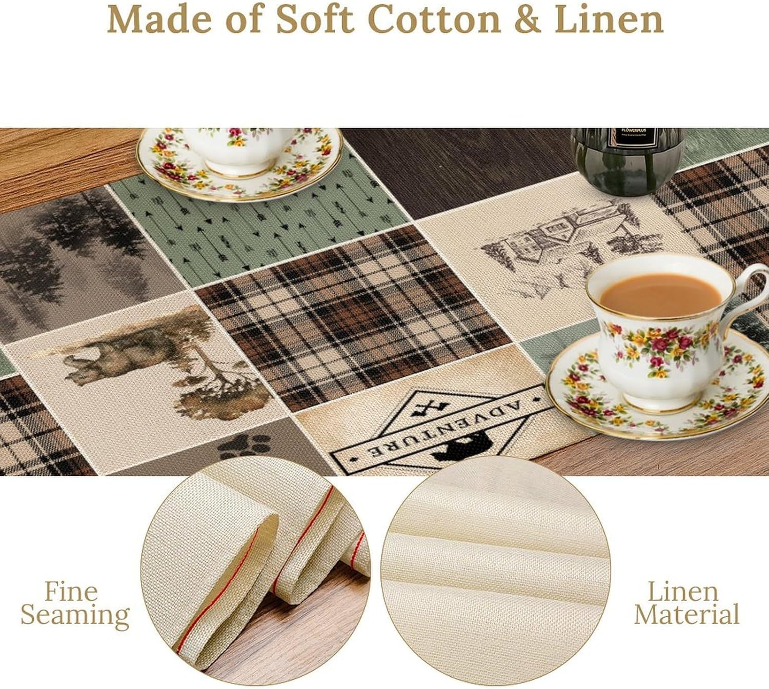 Bear Deer Table Runner,Rustic Lodge Retro Country Farmhouse Buffalo Plaid Print Tablecloth Burlap for Hotel Indoors Outdoor Dining Room Kitchen Home Decor,W13X L36 in