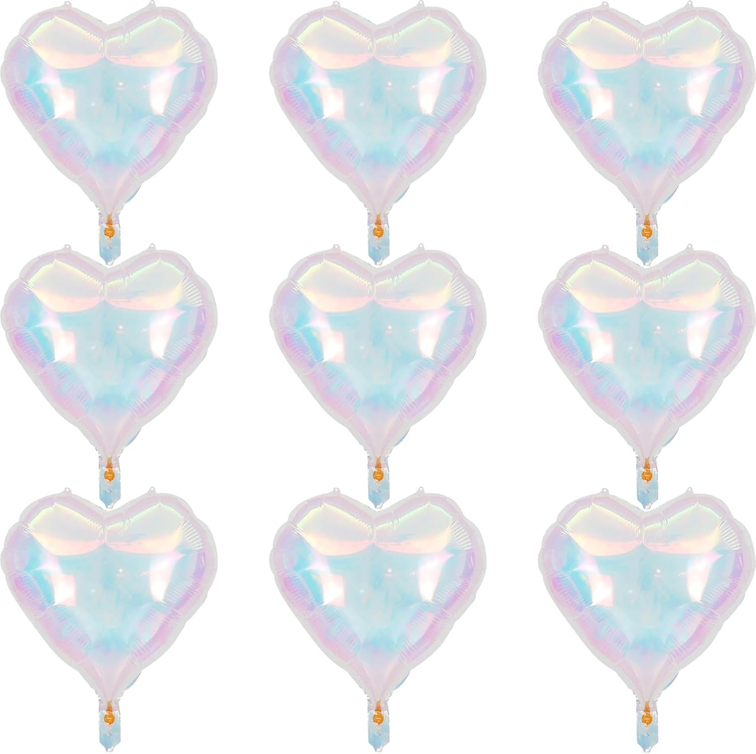- Iridescent Clear Foil Balloons: 9pcs, 18 inch gradient heart shaped foil balloons. Featuring a shimmering rainbow effect, these elegant balloons add a magical touch to any celebration