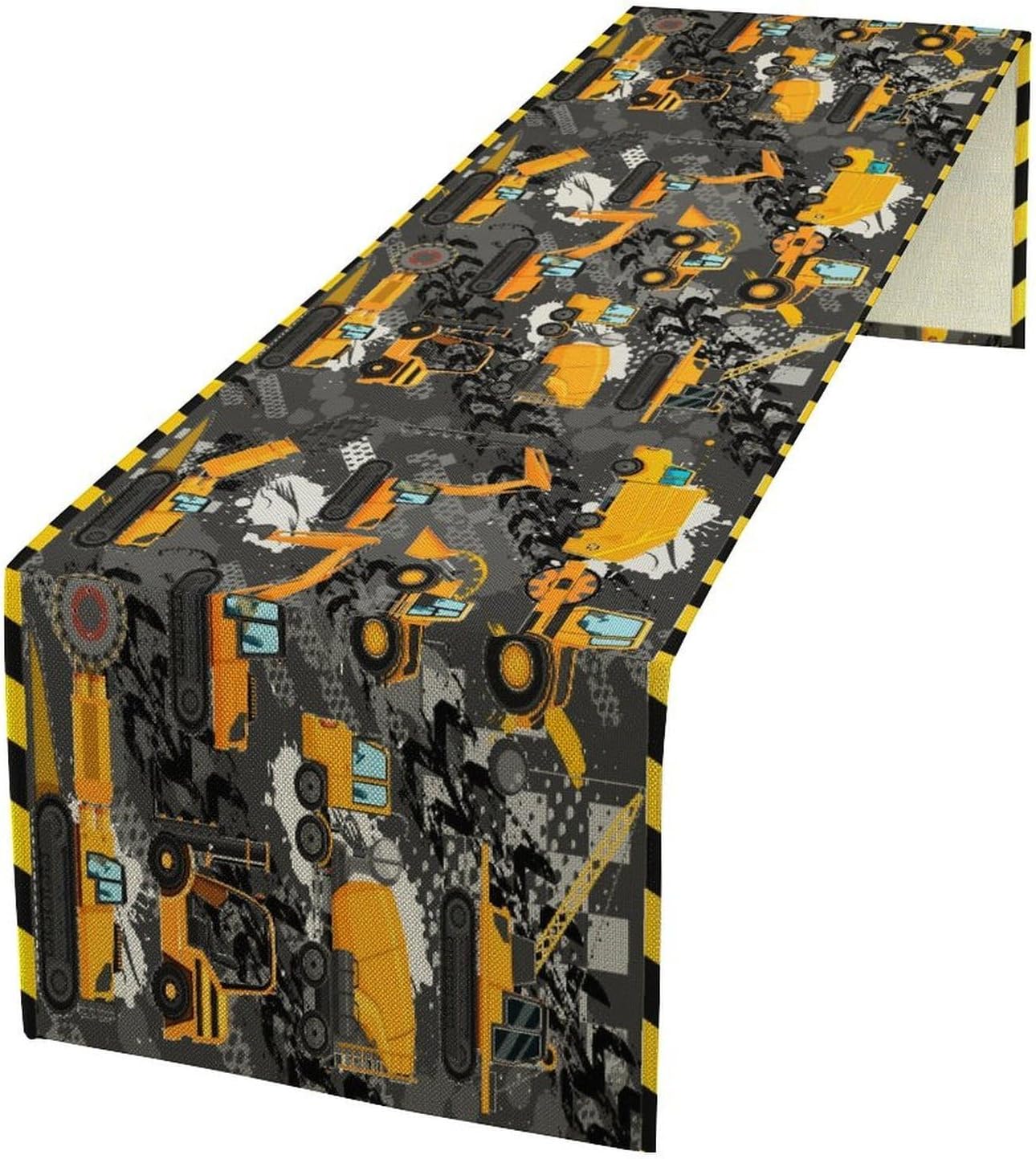 Cartoon Car Table Runner,Boy Kids Construction Yellow Tractor Excavator Tablecloth Burlap for Hotel Indoors Outdoor Dining Room Kitchen Home Decor,W13X L90 in